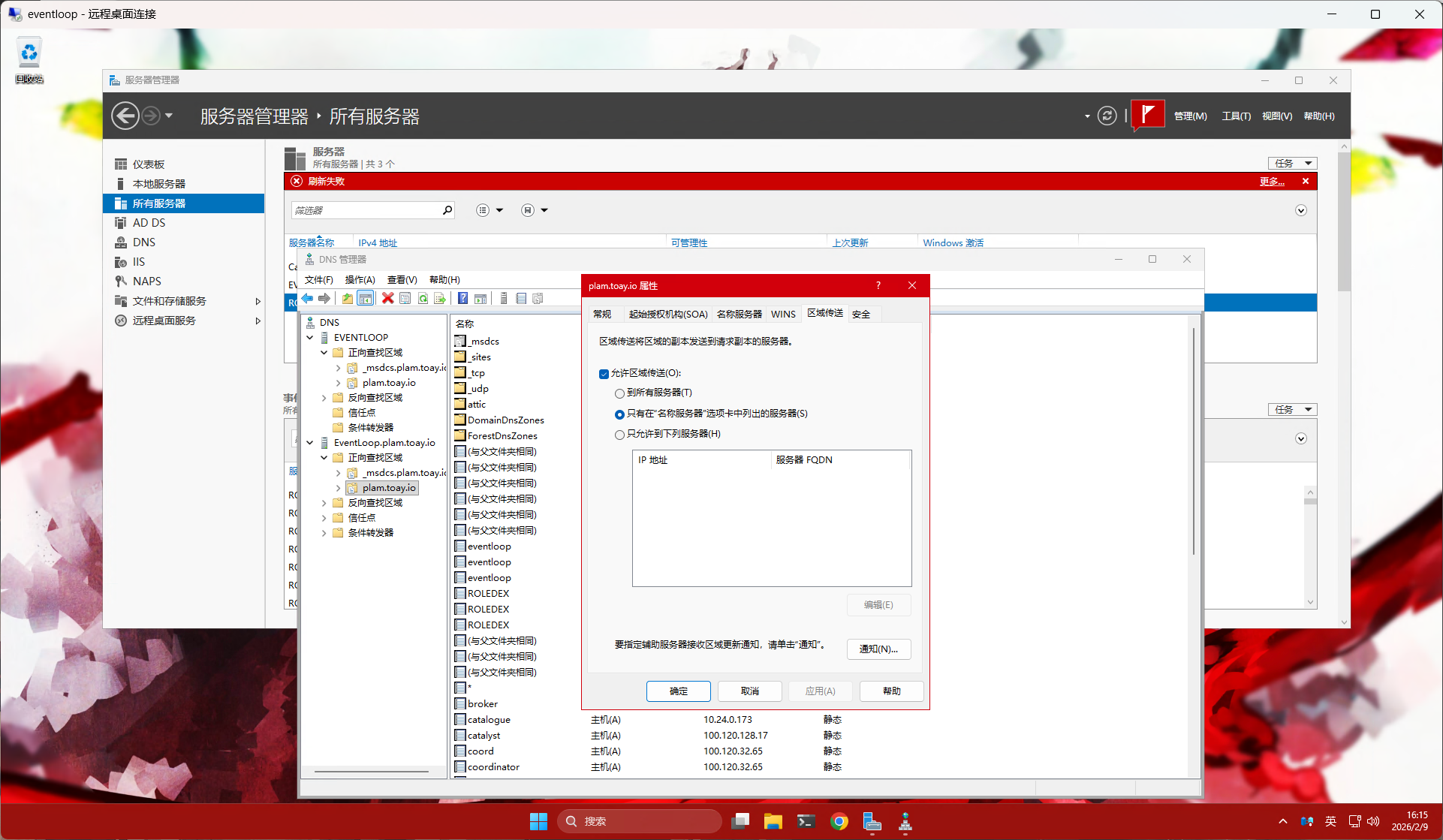 首先打开 DNS 管理器,将要配置为次级 DNS 的服务器解析记录(A/AAAA)添加到主 DNS 上,然后右键正向查找区域中的区域名称(例如我的域名为 plam.toay.io),在属性中的名称服务器选项卡中添加上次级 DNS 即可: